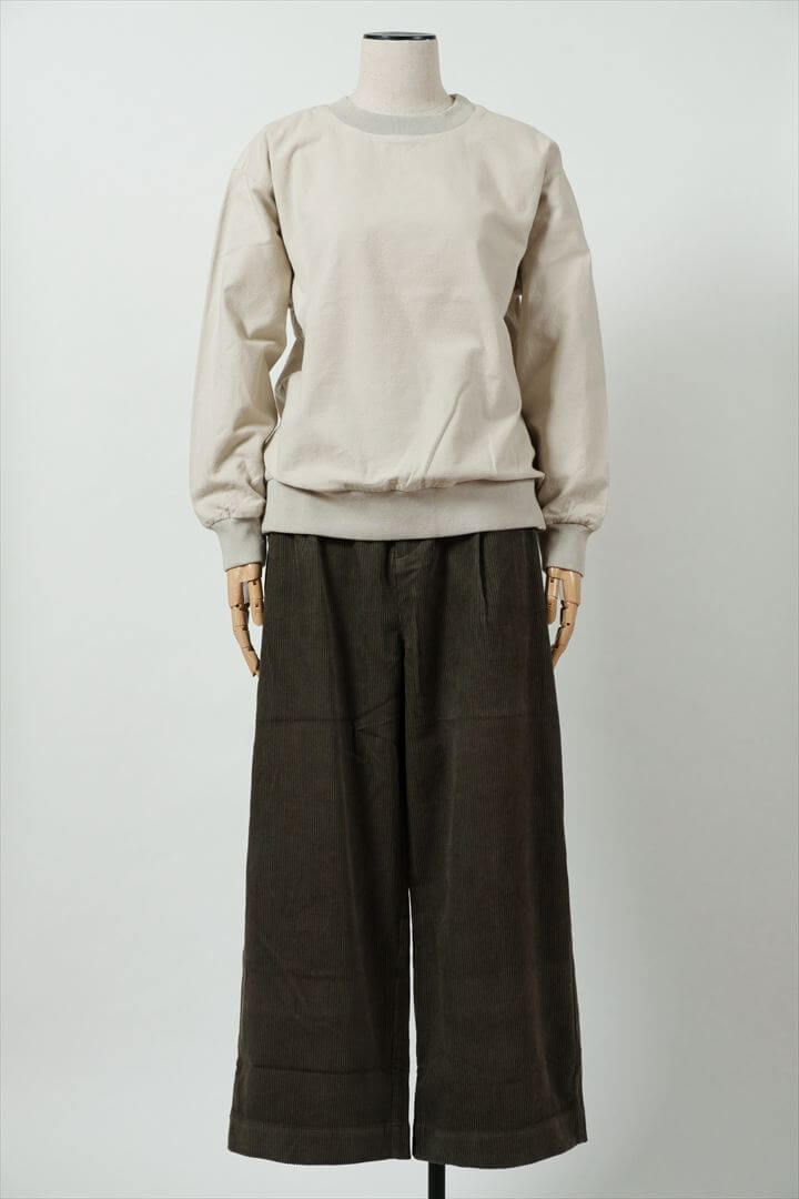 ドロップショルダーでゆとりのあるシルエットのプルオーバーとワイドシルエットテーパードパンツ 太めの畝で暖かパンツです