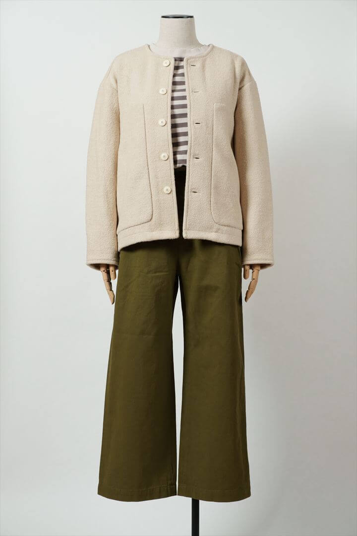 ニットジャージに起毛をかけ温かみのあるジャケット フロントの大きなポケットがpoint パンツはハリのあるコットンチノに洗いをかけ柔らかな肌触りに…