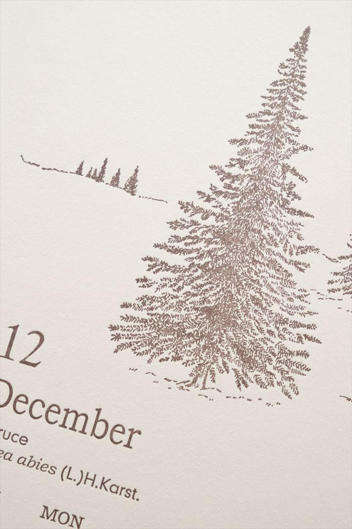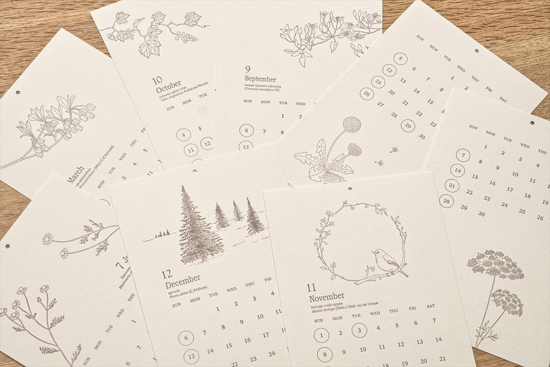 活版印刷で刷られた植物の線画が、独特のやさしい風合いで、ステキなカレンダーです。壁にかけるのに程よいサイズで「はがき大」。毎年人気の商品です。